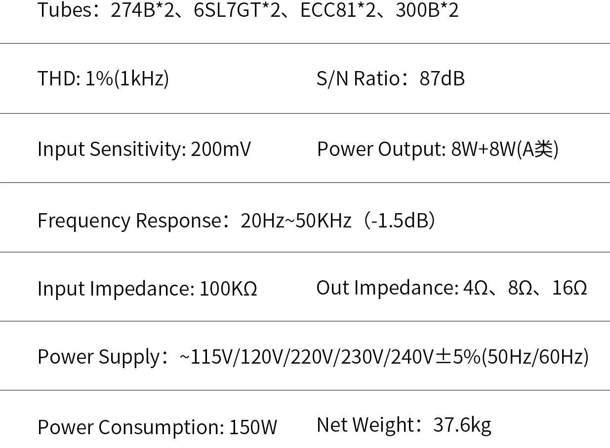 | Output Tubes | 2 x 300B + 2 x 274B (dual configuration) | 1 x 300B or 6C45P (single tube) |