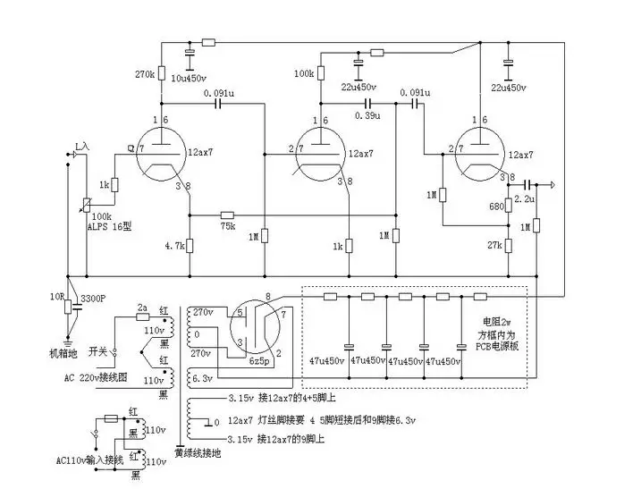 Adopting Japanese original ALPS 16 type shaft length 15mm 100k double-connected potentiometer, the transfer switch is 2*6 file produced by Taiwan-owned factory, you can adjust the positioning port to be changed into *4 file. Use all AC power supply to 3 12ax7 parallel power supply 4+5 short circuit and 9 pin connection 3.15v*2=6.3v